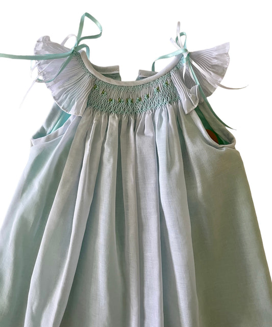 Sleeveless Handsmocked Dress in Green with Bow Detail